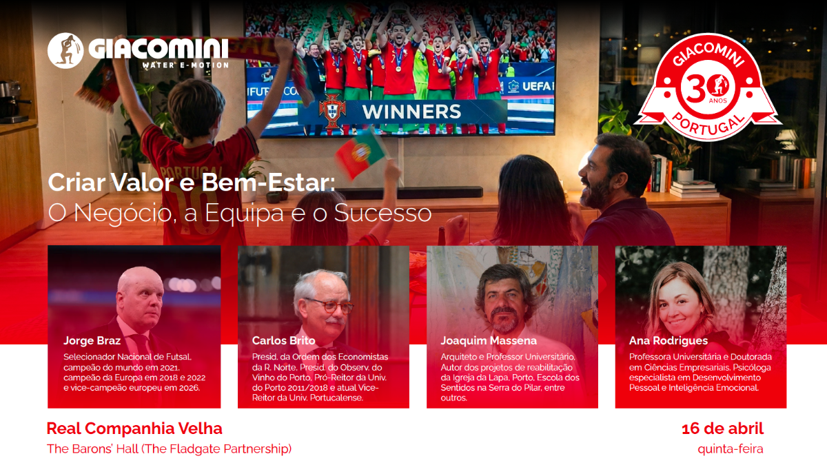 No âmbito das comemorações dos 30 anos, a Giacomini Portugal promove a conferência “Criar Valor e Bem‑Estar: O Negócio, a Equipa e o Sucesso”, um encontro que cruza estratégia, liderança, marketing e psicologia aplicada às organizações. O evento decorre hoje, no The Barons’ Hall (The Fladgate Partnership), em Vila Nova de Gaia.