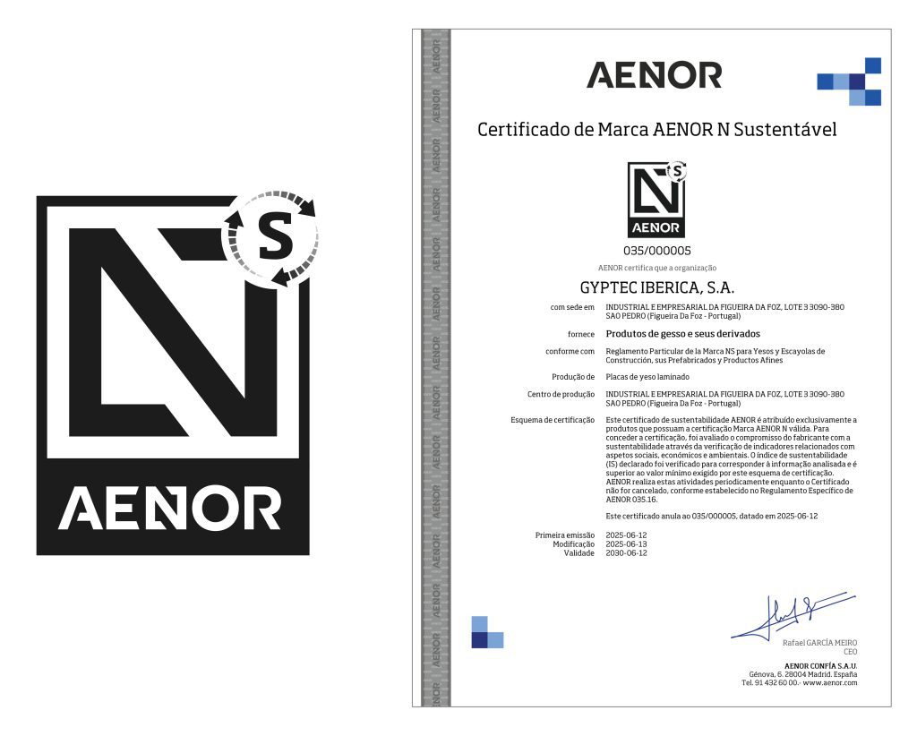 Procurando ser proativa e pioneira nesta área, já em 2025 a Gyptec recebeu a certificação AENOR N Sustentável (Ns). Esta certificação, baseada na certificação de qualidade N, adicionando critérios europeus de sustentabilidade Level(s), avalia periodicamente o compromisso do fabricante com a sustentabilidade, através da verificação de indicadores relacionados com aspetos sociais, económicos e ambientais.