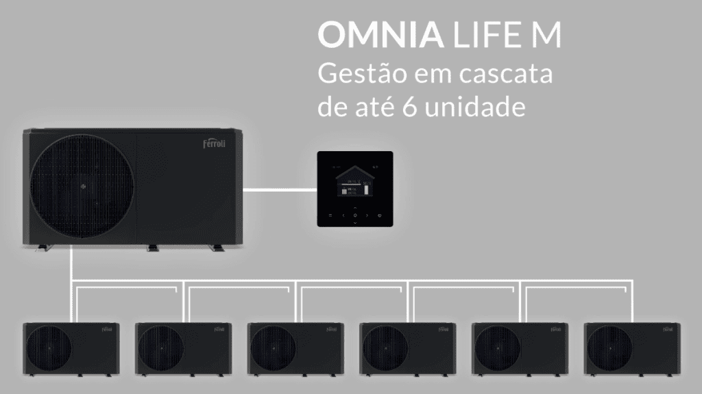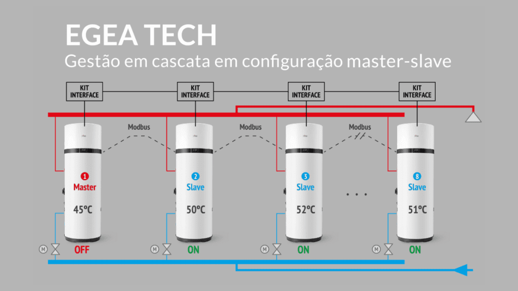 É possível ligar até 8 unidades em cascata e otimizar o funcionamento do conjunto, este tipo de solução pode ser usado em grandes necessidades de AQS, garantindo a temperatura de referência estabelecida com o mínimo consumo elétrico em todos os momentos.