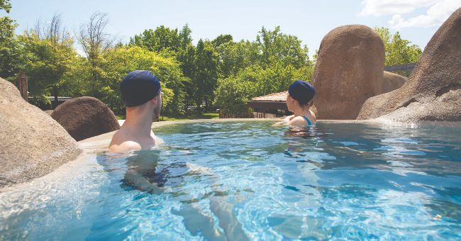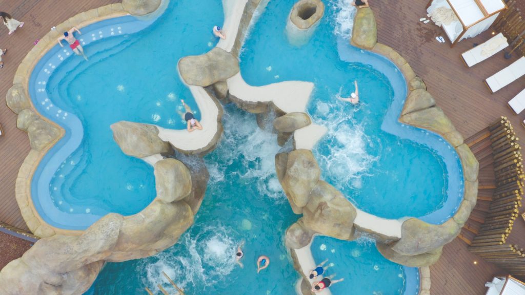 Durante este processo, nasceu o complexo de termas Aquae Salutem. “É mesmo um projecto fora da caixa. É um complexo de piscinas termais, sobre uma rocha artificial. Como são piscinas dinâmicas, existe uma casa de máquinas tremenda, com 53 bombas, tem saunas, turcos, jacuzzis, depois tem uma zona dos sensoriais, com som, luz, simulando trovoadas, vento, fontes de gelo.”
