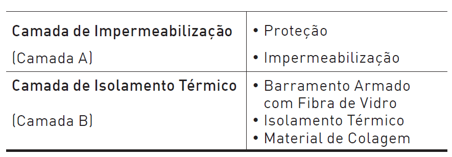 Conforme ilustrado na Figura 1, a cobertura é constituída por camadas que podem ser agrupadas nas categorias: Estrutura, Camada de Isolamento Térmico e Camada de Impermeabilização. O plano de manutenção proativa visa definir as intervenções necessárias para a solução de cobertura proposta, com foco nas camadas de isolamento térmico e de impermeabilização. Neste contexto, as diferentes tipologias de estruturas às quais esta solução pode ser aplicada não foram consideradas. Para a definição dos elementos fontes de manutenção, a camada de impermeabilização é identificada como Camada A, e a camada de isolamento térmico é designada como Camada B, conforme especificado no Quadro 1.