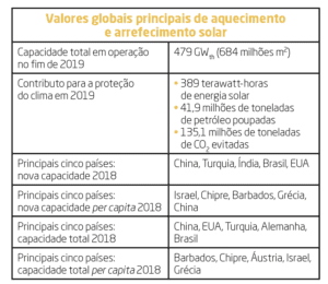 A utilização de energia solar térmica em redes de aquecimento urbano está em alta em todo o mundo. Na Dinamarca, este mercado cresceu aproximadamente 170 % em 2019 e também em outros países, como a China e a Alemanha, principalmente devido à sua melhorada competitividade baseada nos custos. O crescimento do mercado foi também impulsionado pelo aumento da procura para aplicações industriais e agrícolas. Embora os sistemas para aquecimento de água residenciais, o maior sector de mercado, tenham estado sob a pressão das tecnologias concorrentes na China e na Europa Central, as vendas residenciais aumentaram significativamente na África do Sul, na Grécia, no Chipre e no Brasil.